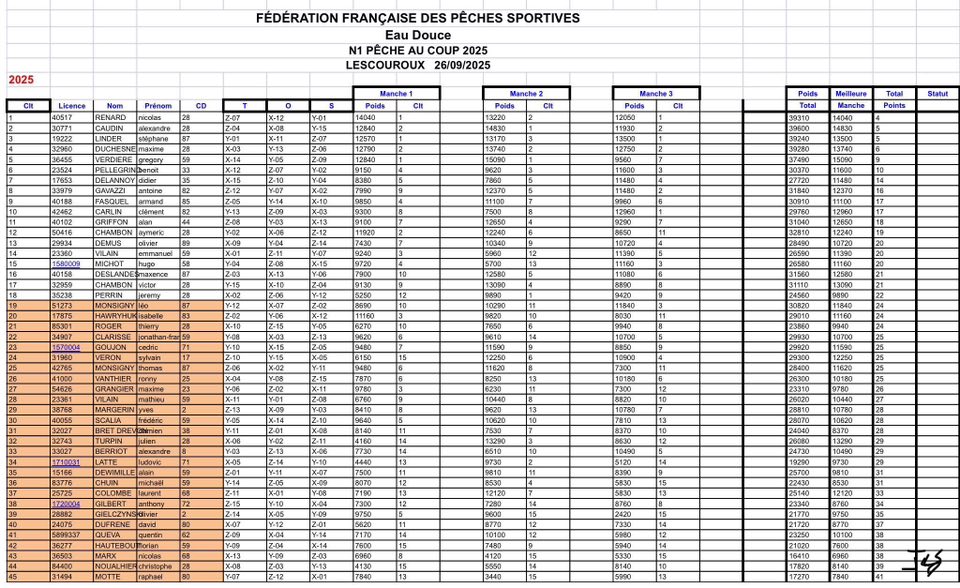 Manche 3 pour finir direction pauvert et les gros numéros au plus profond ou la taille des plaquettes est largement supérieur aux petits numéros – les poissons s’enchainent pendant 2 heures et décident de fuir les gros numéros pour s’installer en masse dans les petits numéros rendant la pêche très délicate sur la dernière heure du championnat et les places qui se perdent au fil des minutes – il est largement devant ses 3 voisins respectifs (11-12 et 14ème) mais on ne sait pas si c’est suffisant pour être milieu de tableau – il faut se rapprocher des 9kgs et avec 199 poissons la balance affiche près de 9.3kg c’est le soulagement chez les coachs – le petit reste en 1ère nationale ! bravo vu le déroulement du championnat