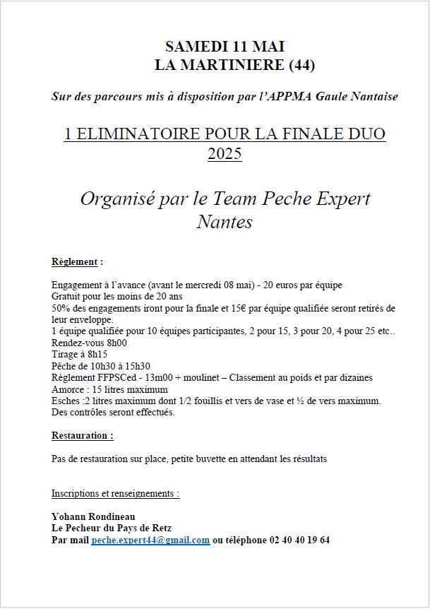 Pêche 10h à 12h30 et 14h à 16h30 sans changement de place,