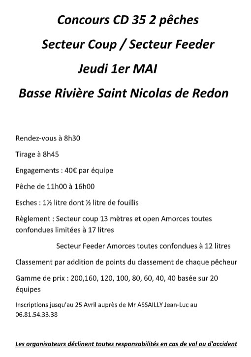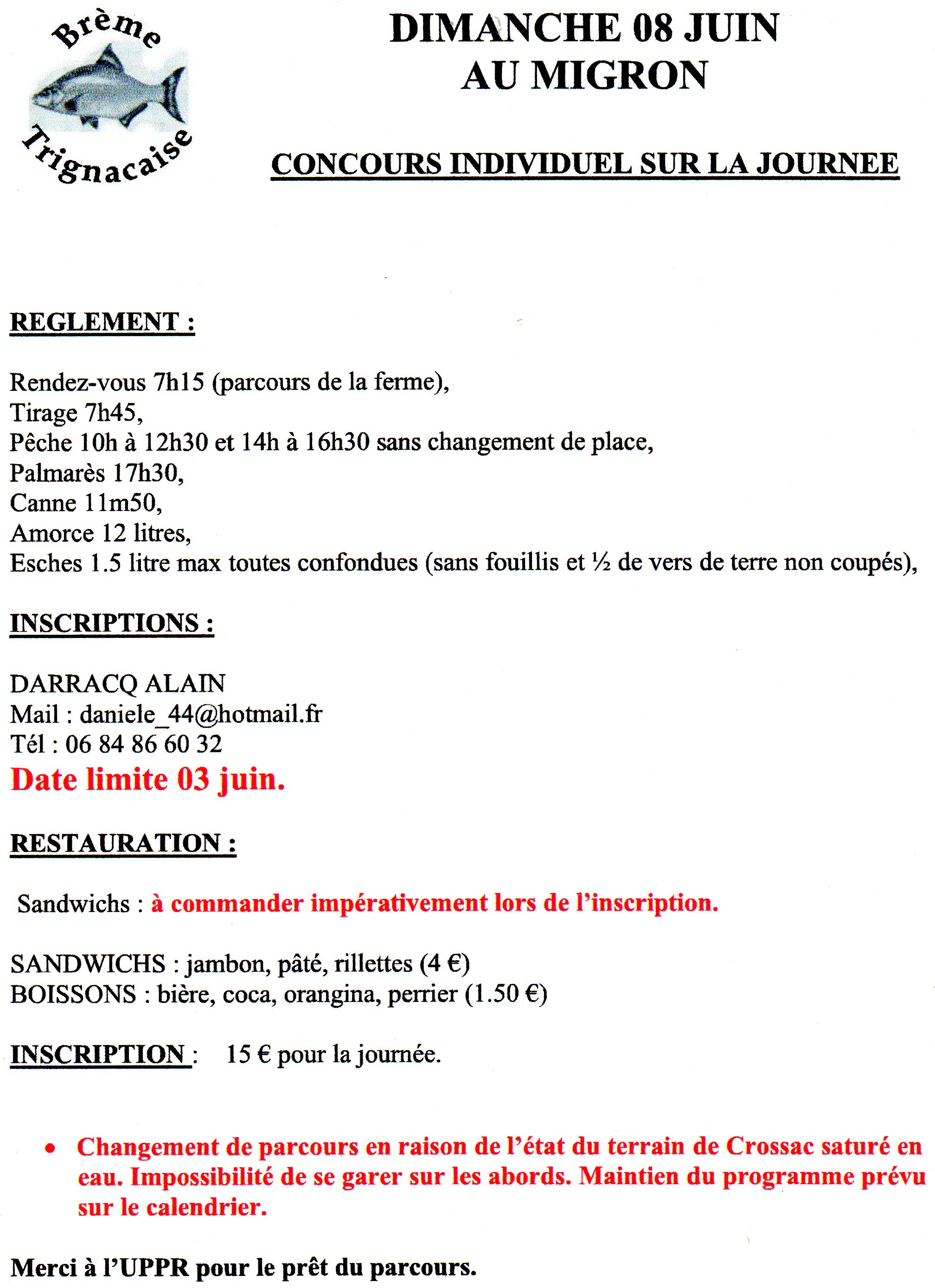 Le concours du 08 juin organisé par la Brème Trignacaise ne pourra se dérouler à Crossac les abords du chemin étant inutilisables (risques d'embourbement). Nous le déplaçons sur le parcours du Migron avec l'accord de l'UPPR. Voir affiche ci-jointe.
